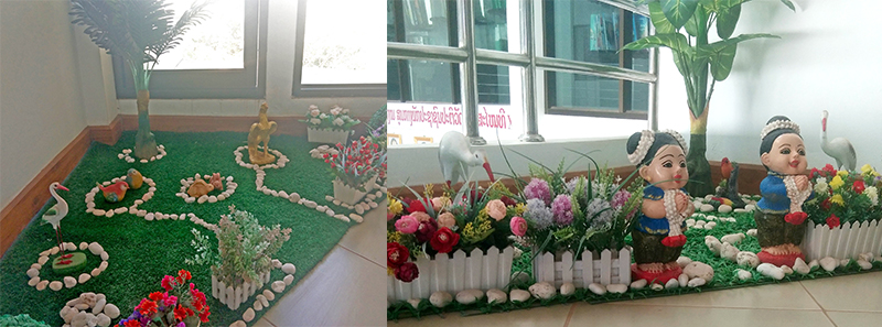 樓梯拐角處布置有陳設(shè)點,用一些白色石頭拼湊圖案,輔以盆栽、鮮花、小人等裝飾,濃厚的學習氛圍中透出一絲活潑。