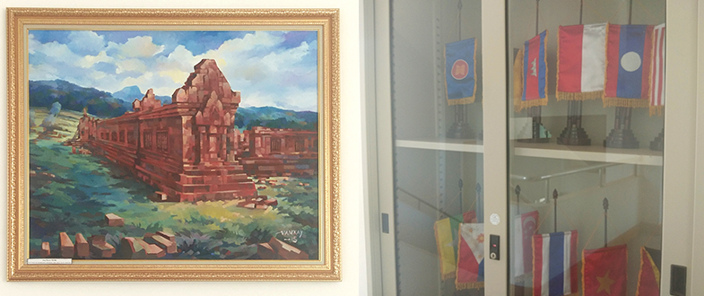 二樓樓梯拐角處掛著老撾古老寺廟油畫,旁邊的柜子里整齊擺放著幾排各國國旗;三樓樓梯拐角處掛的則是川壙省石缸平原油畫,旁邊的柜子里放置著一些老撾紀念品。