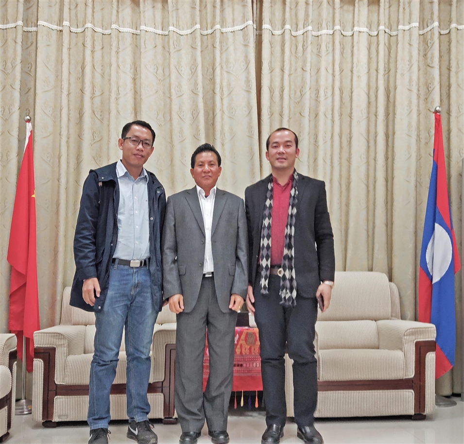 老撾駐南寧總領(lǐng)事館副領(lǐng)事坎平(中間)與老撾蘇州大學(xué)校長(zhǎng)助理馮溫格(左一)、廣西金沛教育執(zhí)行董事粟宥朝(右一)合影留念