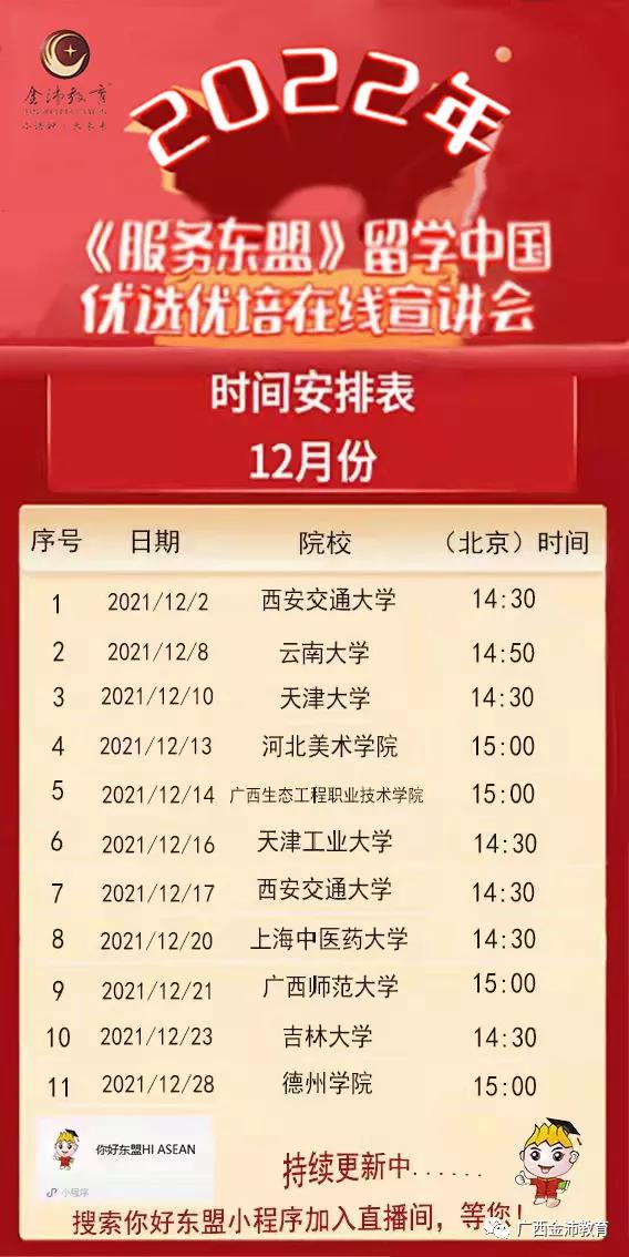 2021122日起,由我司聯(lián)合多所高校開展的“2022年留學(xué)中國優(yōu)選優(yōu)培線上直播宣講會將積極利用直播新形勢在你好東盟微信小程序上進行開播。學(xué)校和師生、家長可通過小程序你好東盟、FacebookYoutube直播等多種途徑收看本次宣講會。