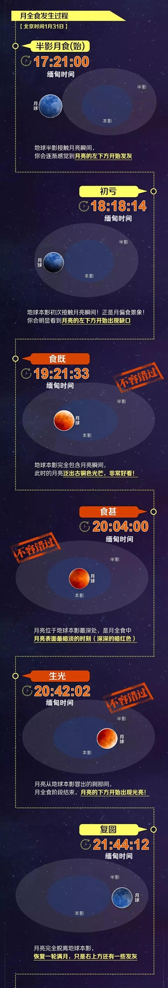 那么,今年的“血月”將在哪些時間段出現(xiàn)?為什么還會有藍(lán)月亮?欣賞和拍攝的最佳時間、位置怎么選?提前要準(zhǔn)備些什么呢?答案都在此啦↓