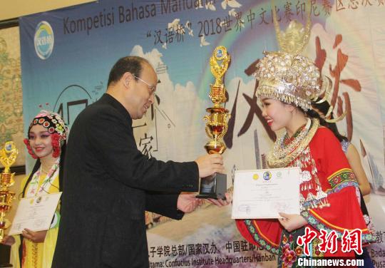 肖千為獲得大學(xué)組一等獎的選手頒獎并致辭。他說,“漢語橋”中文比賽已經(jīng)走過了17個春秋,吸引了包括印尼在內(nèi)的110多個國家的上萬名青少年參賽,成為國際人文交流領(lǐng)域的一大知名品牌。各國青年學(xué)生通過參加比賽,不僅提高了漢語水平,體驗了中國文化,而且向中國和世界人民展示了各自國家的獨特文化風采。