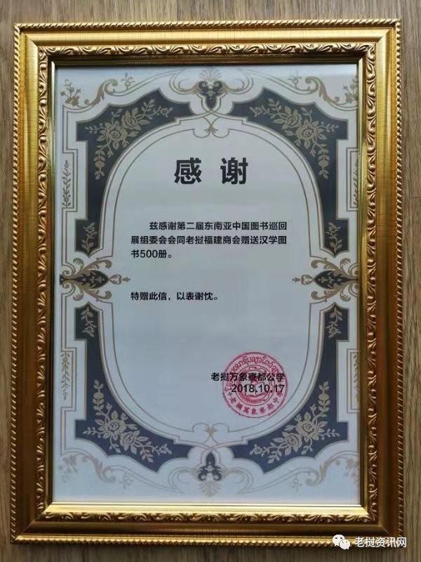 贈(zèng)書(shū)活動(dòng)儀式安排在學(xué)校會(huì)議室舉行,寮都公學(xué)董事長(zhǎng)林俊雄從老撾福建商會(huì)代表們手中接過(guò)由第二屆東南亞中國(guó)圖書(shū)巡回展組及老撾福建商會(huì)共同向竂都公學(xué)捐贈(zèng)的價(jià)值近3萬(wàn)元的圖書(shū)。據(jù)介紹,本次捐贈(zèng)圖書(shū)內(nèi)容涵蓋中國(guó)傳統(tǒng)文化、經(jīng)典文學(xué)、漢語(yǔ)學(xué)習(xí)為主等各類圖書(shū)500冊(cè)。交接儀式結(jié)束完畢后,林俊雄董事長(zhǎng)當(dāng)場(chǎng)向老撾福建商會(huì)代表頒發(fā)了受贈(zèng)感謝狀。