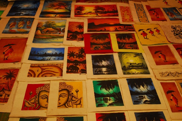 老撾原生態(tài)的手工藝造紙非常有名,也是在市場(chǎng)上最常見(jiàn)的一種工藝品,包括紙畫(huà)、紙燈罩、名信片、筆記本等種類。這種紙質(zhì)藝術(shù)品的繪畫(huà)內(nèi)容多與佛教有關(guān),極具老撾特色。