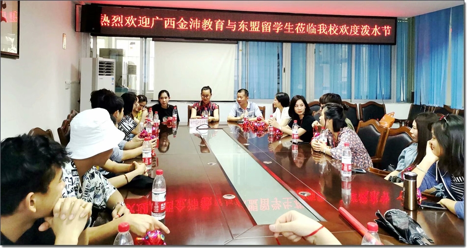 南寧市第十五中學(xué)盧副校長及譚主任親自到校門迎接并在會議室熱情接待了大家。在歡迎會上,盧副校長向東盟各國留學(xué)生介紹了學(xué)校概況并送上壯族特色的繡球表示歡迎。南寧市第十五中學(xué)是東盟文化相融合的特色高中,至此高考來臨之際,為增進師生互動,緩解高三學(xué)子的考試壓力,學(xué)校以東盟特色的潑水方式傳遞祝福、共同祈愿,同時也為中國學(xué)生與留學(xué)生提供了一個文化交流平臺。