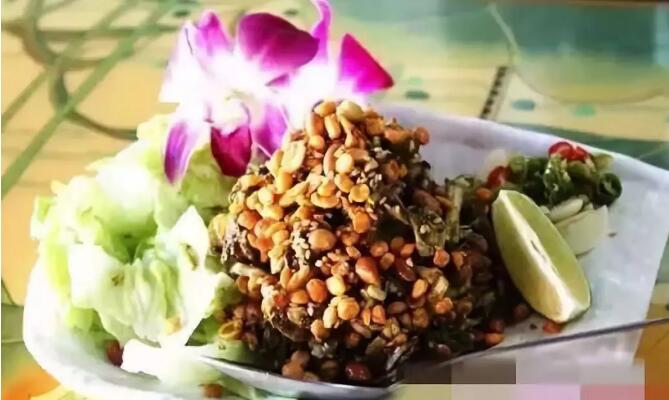 或許緬甸最知名的食物就屬茶葉沙拉了,被稱作緬甸的國(guó)菜。大家常把茶葉作為甜點(diǎn)吃,但有時(shí)分茶葉也會(huì)作為茶葉沙拉的質(zhì)料呈現(xiàn)。