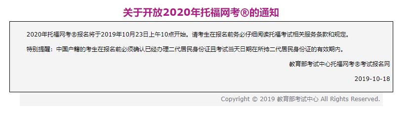 教育部考試中心托福網(wǎng)考考試報(bào)名網(wǎng)發(fā)布了通知,2020年托福報(bào)名將于2019年10月23日上午10點(diǎn)開(kāi)始。