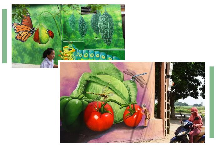 褚舍村以安全蔬菜種植業(yè)聞名,因此15幅大型壁畫重現(xiàn)了當(dāng)?shù)剞r(nóng)民的日常生活畫面,從各種農(nóng)作物、蔬菜、果園,壁畫中一個純農(nóng)業(yè)小村的畫面給參觀者帶來一種自然和美麗的視覺效果。