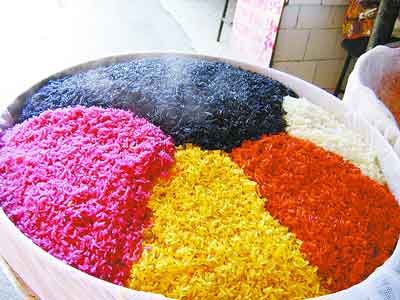 節(jié)前家家戶戶準(zhǔn)備五色糯米飯,人們采來紅蘭草、黃飯花、楓葉、紫蕃藤,用這些植物的汁浸泡糯米,做成紅、黃、黑、紫、白五色糯米飯。相傳,這種食品是深得仙女們的贊賞后流傳下來的;也有人說是祭祀歌仙劉三姐的。吃了這種飯,人丁興旺,身體健壯。