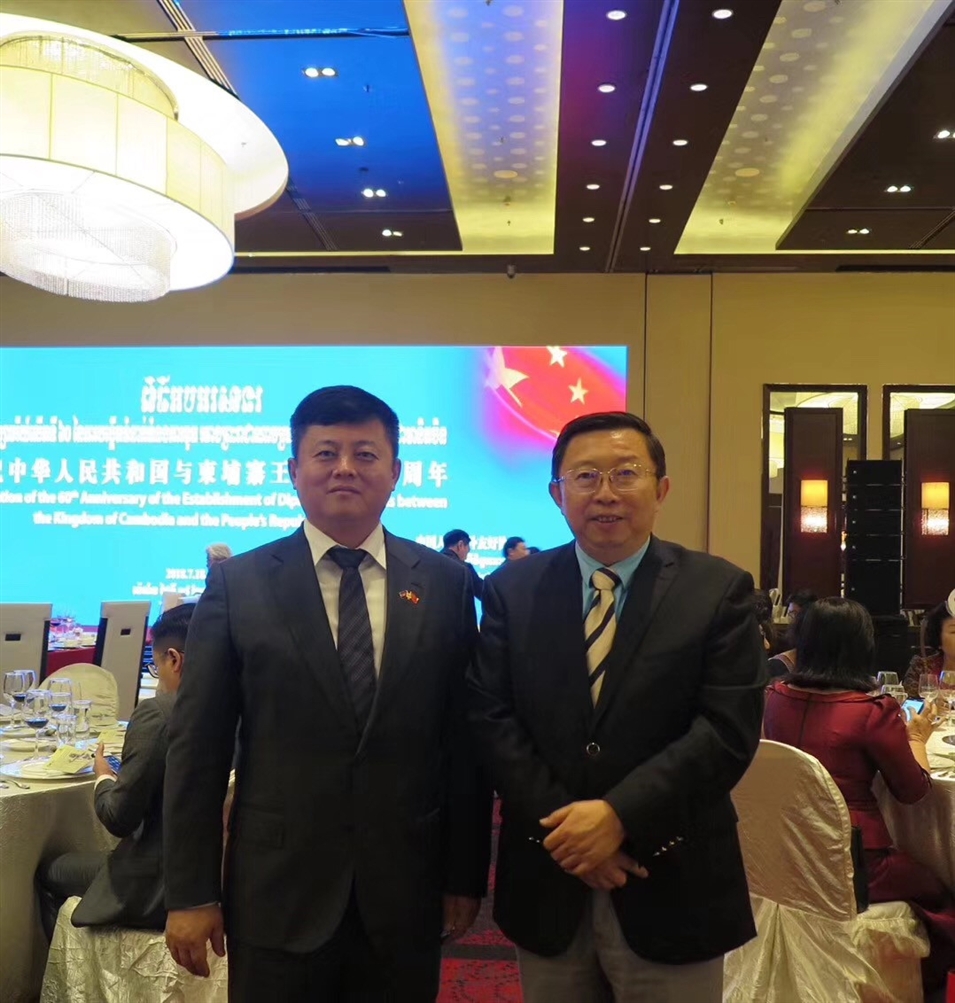 2018年北京,應(yīng)柬埔寨駐華大使邀請(qǐng),中國(guó)—東盟商務(wù)理事會(huì)執(zhí)行理事長(zhǎng)許寧寧出席慶祝中柬建交60周年招待會(huì)。招待會(huì)上,與柬埔寨駐華大使館公使銜商務(wù)參贊鐵弓交談。