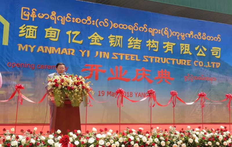 2018年仰光市,中國—東盟商務理事會執(zhí)行理事長許寧寧應邀在緬甸億金鋼結(jié)構(gòu)公司開業(yè)盛典上致辭:中緬企業(yè)增進合作、共同發(fā)展。該公司是中緬合資,是緬甸最大的鋼結(jié)構(gòu)加工和安裝企業(yè),承建了包括緬甸國家體育館、曼德勒商務與會議中心等多個標志性建筑。