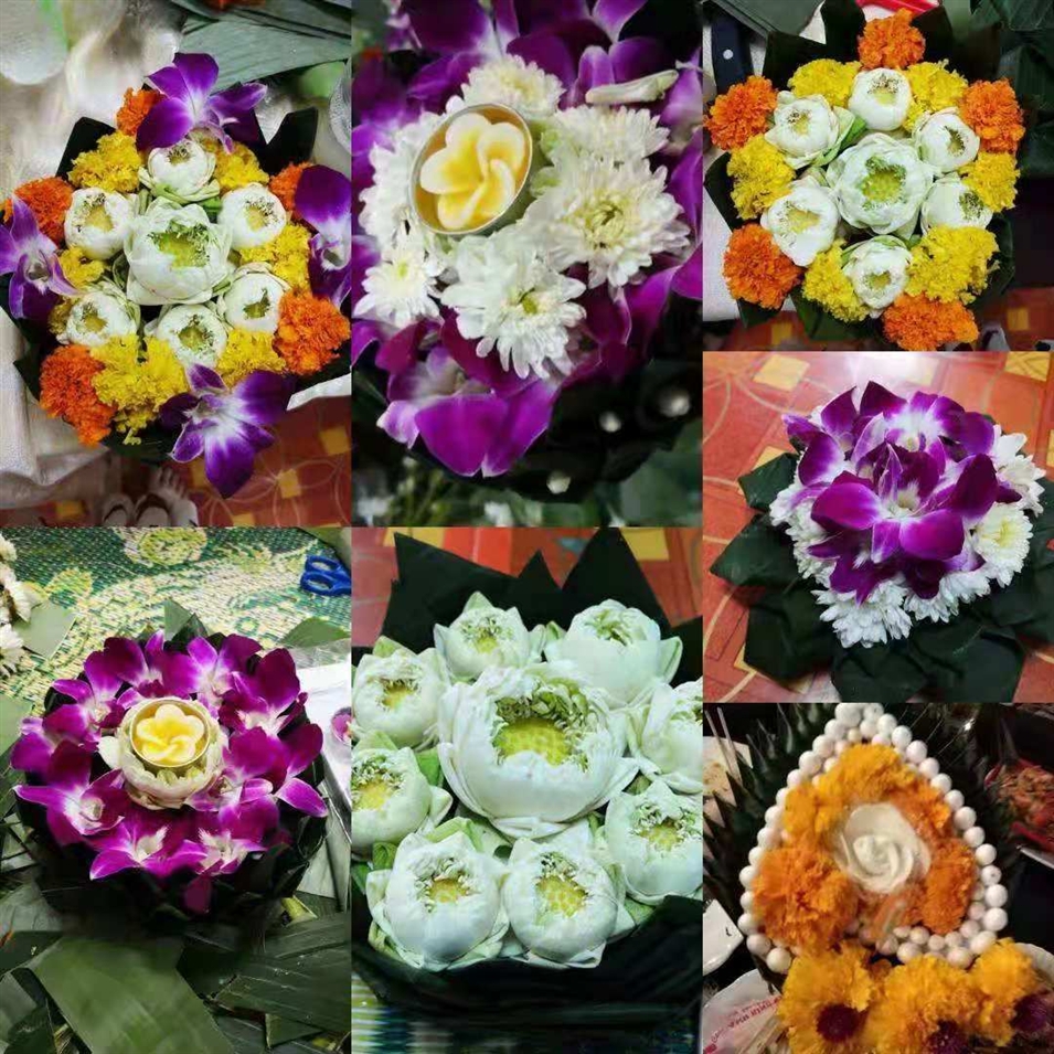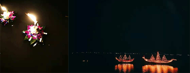 水燈是用象征著力量和財富的芭蕉葉折疊制成的,有的折成葵花狀,有的折成寶塔狀,折好的水燈上會插上鮮花和香燭,燃放爆竹之后,人們將香燭點燃,緩緩放入水中。剎那間,映著傾城月色,河面上燈火萬點,忽遠(yuǎn)忽近,隨波漂蕩,蔚為壯觀。