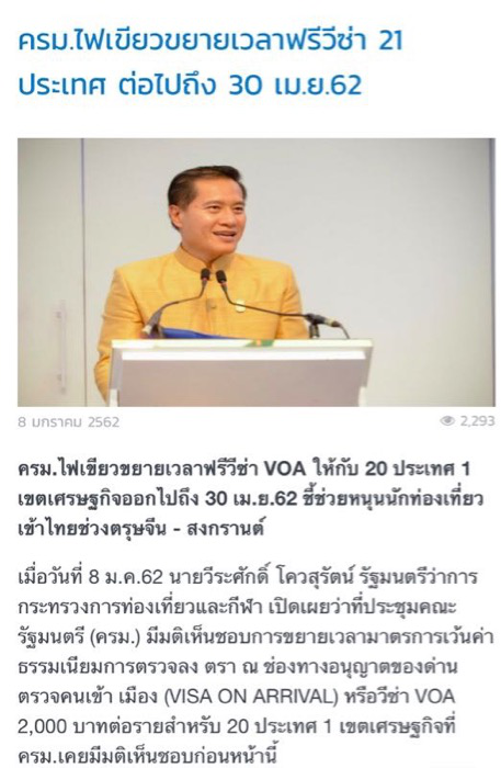 018年12月16日,泰國旅游業(yè)協(xié)會(ATTA)會長威奇曾表示,泰國旅游協(xié)會已向泰國旅游與體育部長和泰國旅游局提案,將落地簽免費政策延期3個月,以促使該政策延期至2019年第1季度,估計12月底將獲得答復。