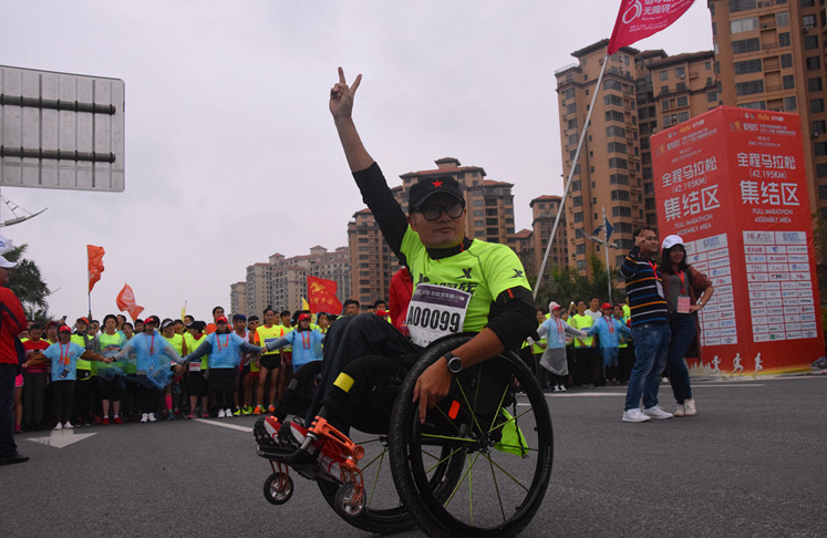 在眾多的選手中,坐在輪椅上的張先生顯得尤為搶眼。張先生來自廣州,他告訴記者,這是他參加的第54場馬拉松比賽,也是第一次參加全海景跑道的馬拉松, “我參加比賽不是為了出成績或出風(fēng)頭,而是重在參與,是想體現(xiàn)一種精神?!睆埾壬f,他不一定能全部“跑”完全程,但他一定會堅持到最后。