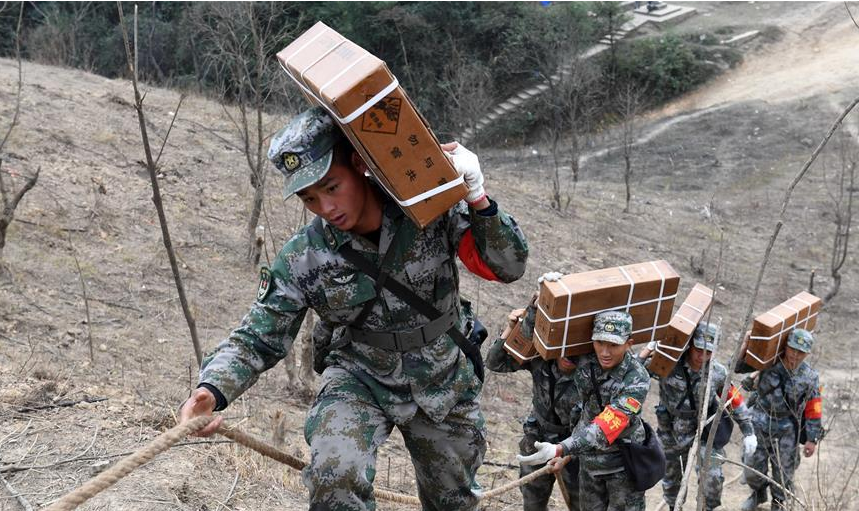 掃雷官兵在中越邊境廣西段某雷場搬運(yùn)炸藥,準(zhǔn)備爆破作業(yè)(12月22日攝)。掃雷官兵在作業(yè)前要對雷區(qū)進(jìn)行爆破作業(yè),清除雷場植被,方便后期搜排。